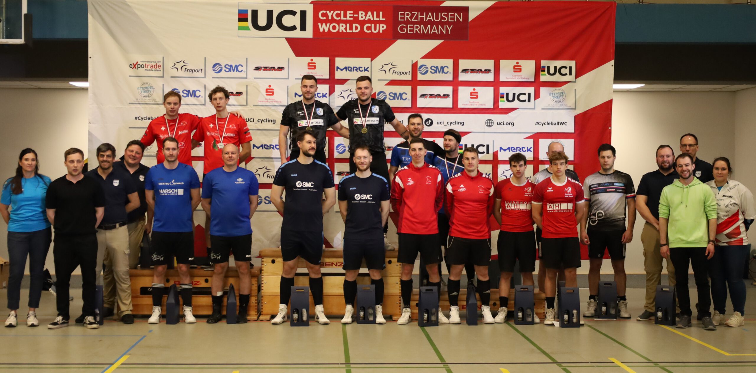 Zu Beginn der Abendveranstaltung durfte sich der Nachwuchs der Radsportabteilung mit einem Showact ebenfalls in den Weltcup mit einbringen. Mit der Show „Ein Rad verbindet uns“ durften die Nachwuchssportler:innen die Finalveranstaltung einläuten. Unter großem Applaus verliesen die Sportler:innen das Feld, im Gegenzug durfte das Erzhäuser Radball Team mit diesem das Spielfläche betreten. Im letzten Vorrundenspiel gegen Denkendorf (GER) ging es um den 3. Platz in der Gruppenphase und die Qualifikation zum Spiel um Platz 5. Nach ausgeglichener erster Halbzeit und einem Spielstand von 2:2 sollte das Match eine unerwartete Dramatik erfahren. Nachdem es bereits 3:5 aus Erzhäuser Sicht stand, gaben Florian und Dominik nicht auf. In der allerletzten Sekunde konnte Dominik den verdienten 5:5 Ausgleich erzielen. Nach Freude über dieses Last-Minute Tor musste im 4-Meter-Schießen der 3. Platz ausgespielt werden. Nach 2 eigenen Treffern und 3 gehaltenen 4-Metern gab es in der Halle kein halten mehr. Die Erzhäuser gewannen mit 2:0 und belegten damit den 3. Platz in der Gruppe.